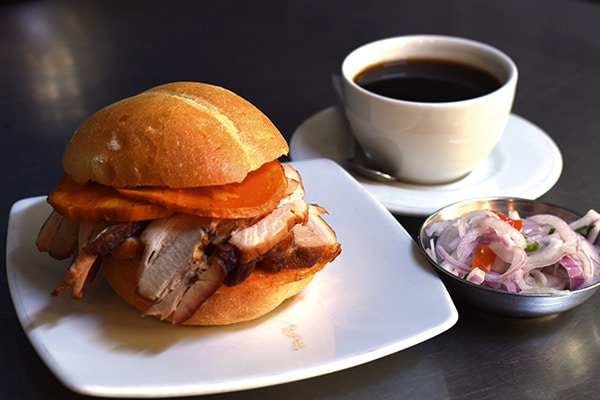 El pan con chicharrón es uno de los platos más tradicionales de Chiclayo. Preparado con carne de cerdo crocante, acompañado de camote y zarza criolla, es un desayuno típico muy apreciado por su sabor y tradición.